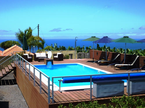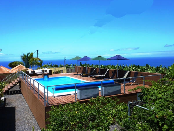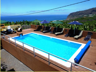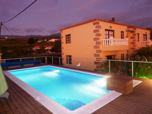 Der Pool besitzt eine Größe von 9 X 4 m, das Pooldeck hat eine Sitzecke und eine großzügige Liegefläche mit perfektem Blick über die Bananenplantagen und Tazacorte weiter zum Meer. Weiterhin gibt es eine warme Dusche und für die kühleren Monate eine Wärmepumpe, mit der wir auch im Winter schwimmfähige Temperaturen erzeugen können.